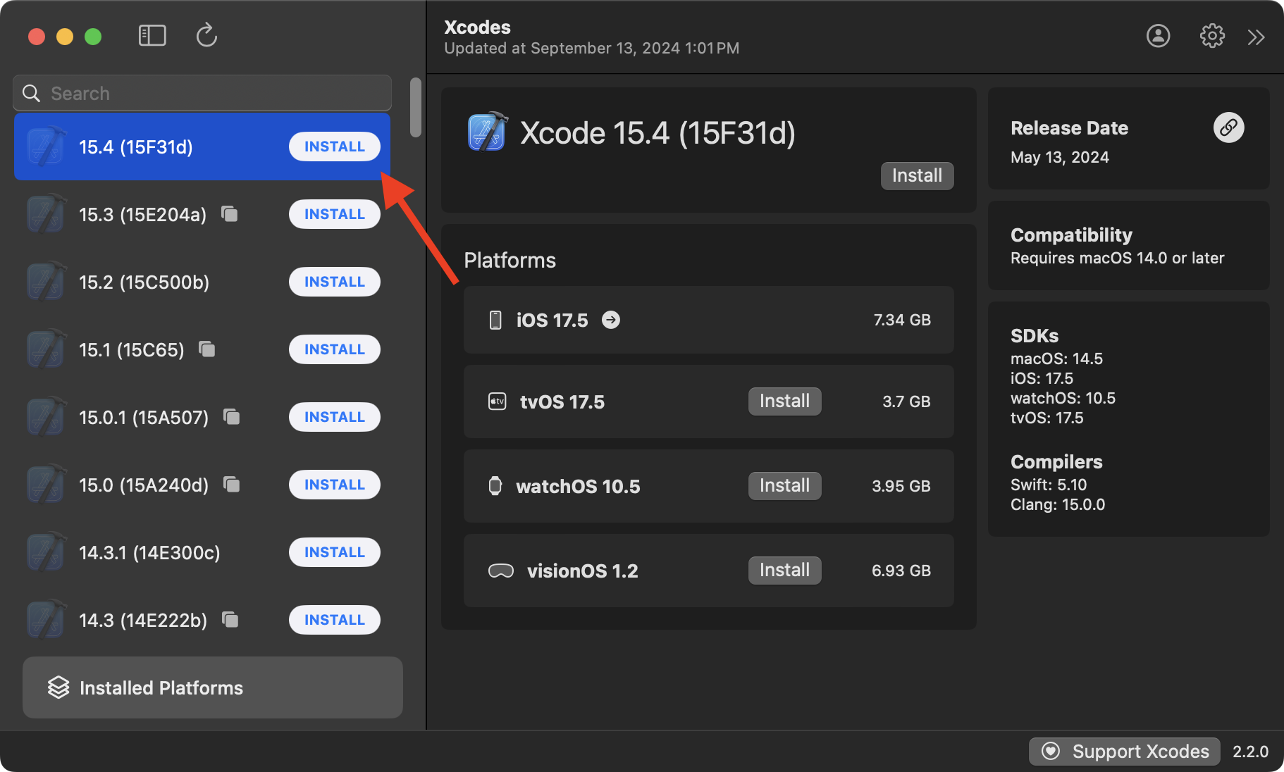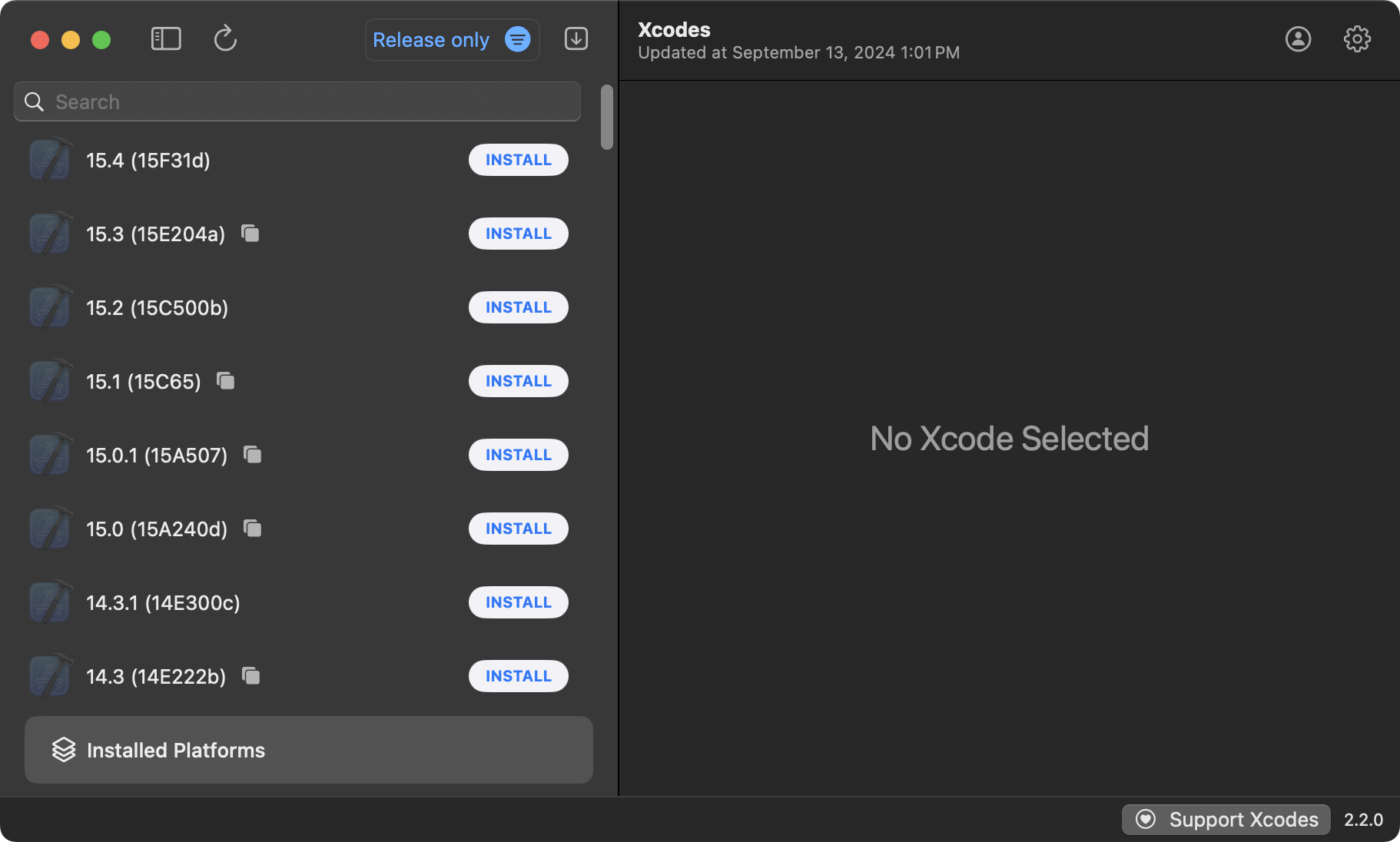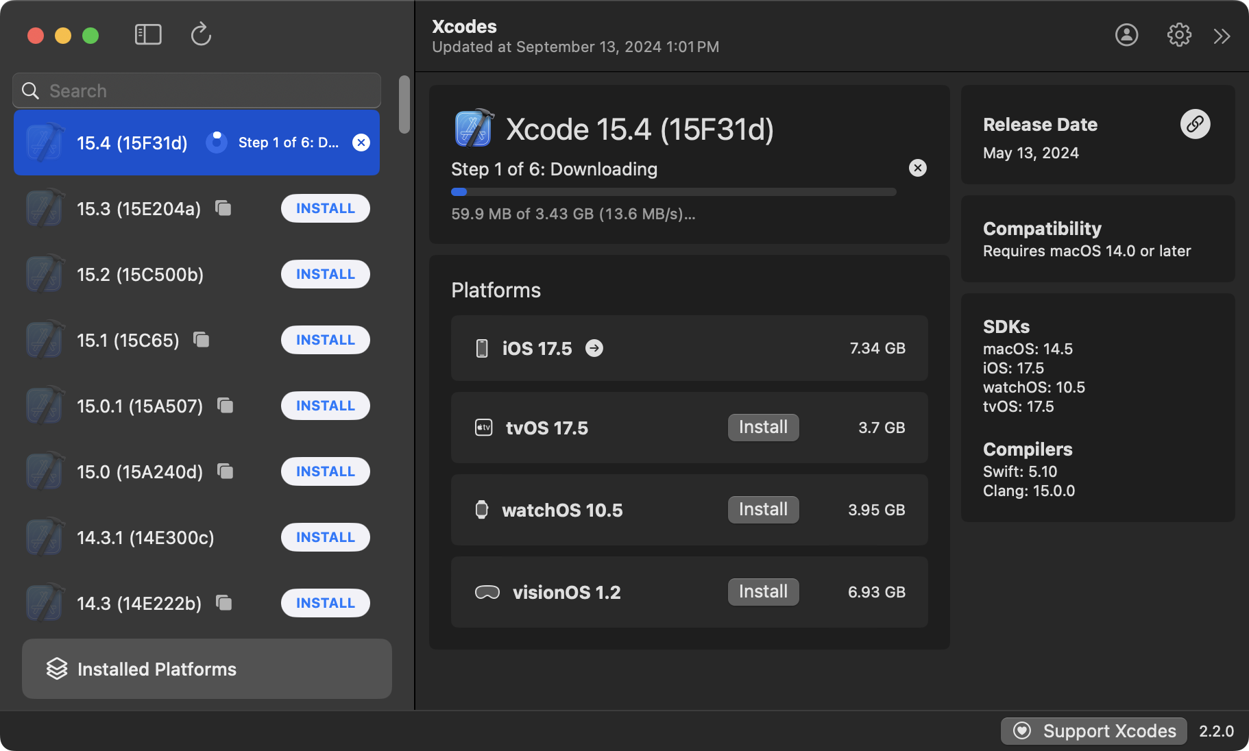 Recall that Xcodes is an app used to manage the installation of different versions of Xcode: