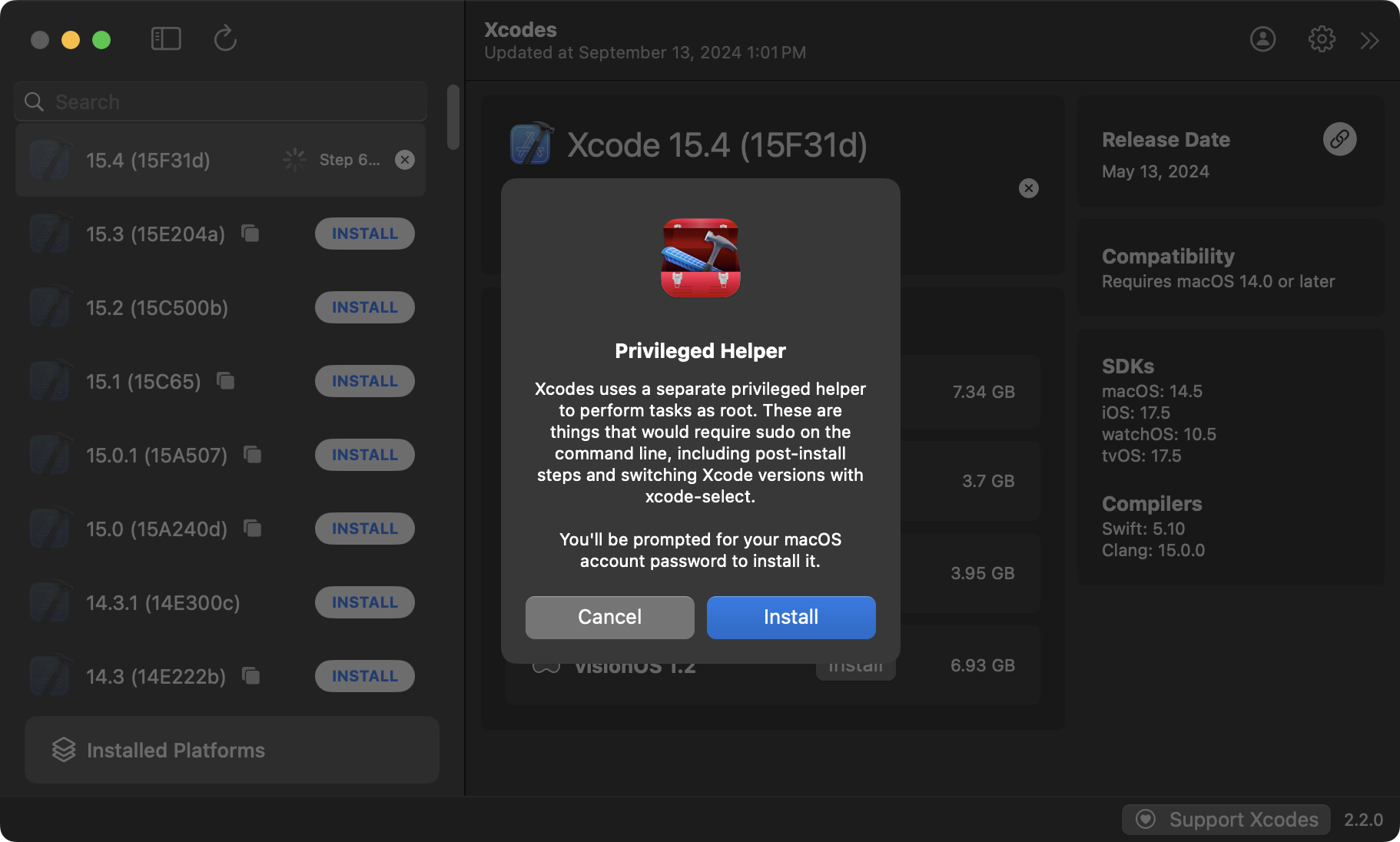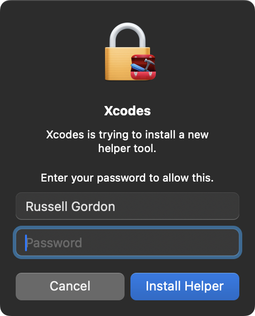 Once Xcode has been downloaded, if this is the first time you’ve used Xcodes in a while, you may see this message regarding the need to install a privileged helper tool – allow this to occur by pressing Install: