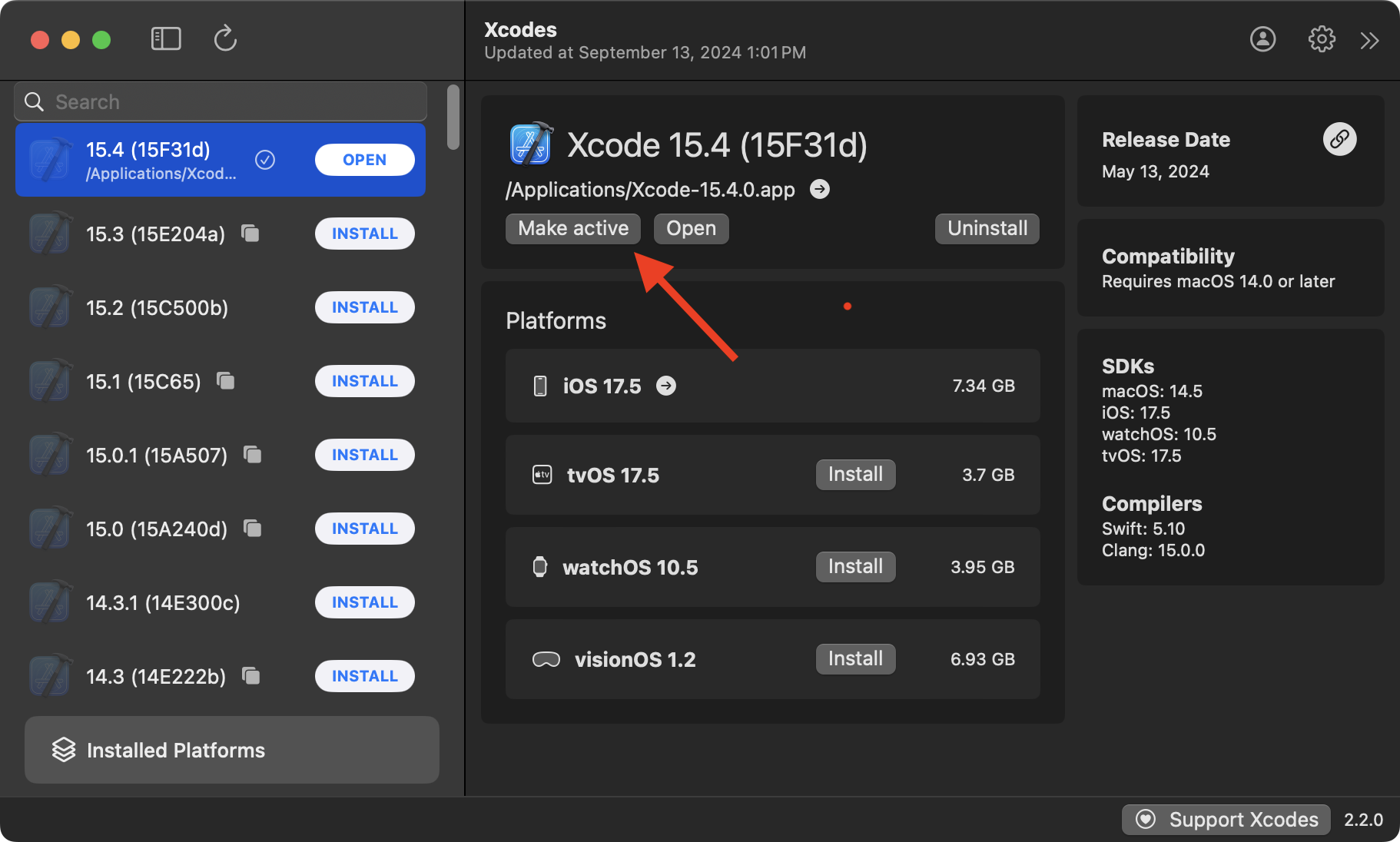 Press the Make active button so that Xcode 15.4 becomes the default version of Xcode – this means that when you double-click a .xcodeproj file, Xcode 15.4 is what will open: